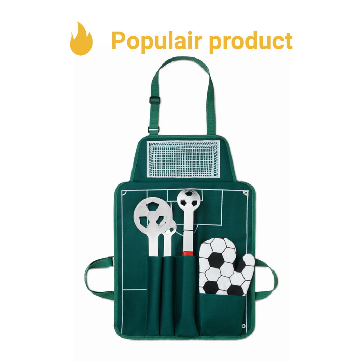 Dit leuke schort in de sfeer van voetbal is een ideaal cadeau voor elke BBQ liefhebber. Met alles wat je nodig hebt voor tijdens het barbecueën. Een spatel, vleesvork, tang en een want, die allemaal een uitstraling vanuit het voetbal hebben.